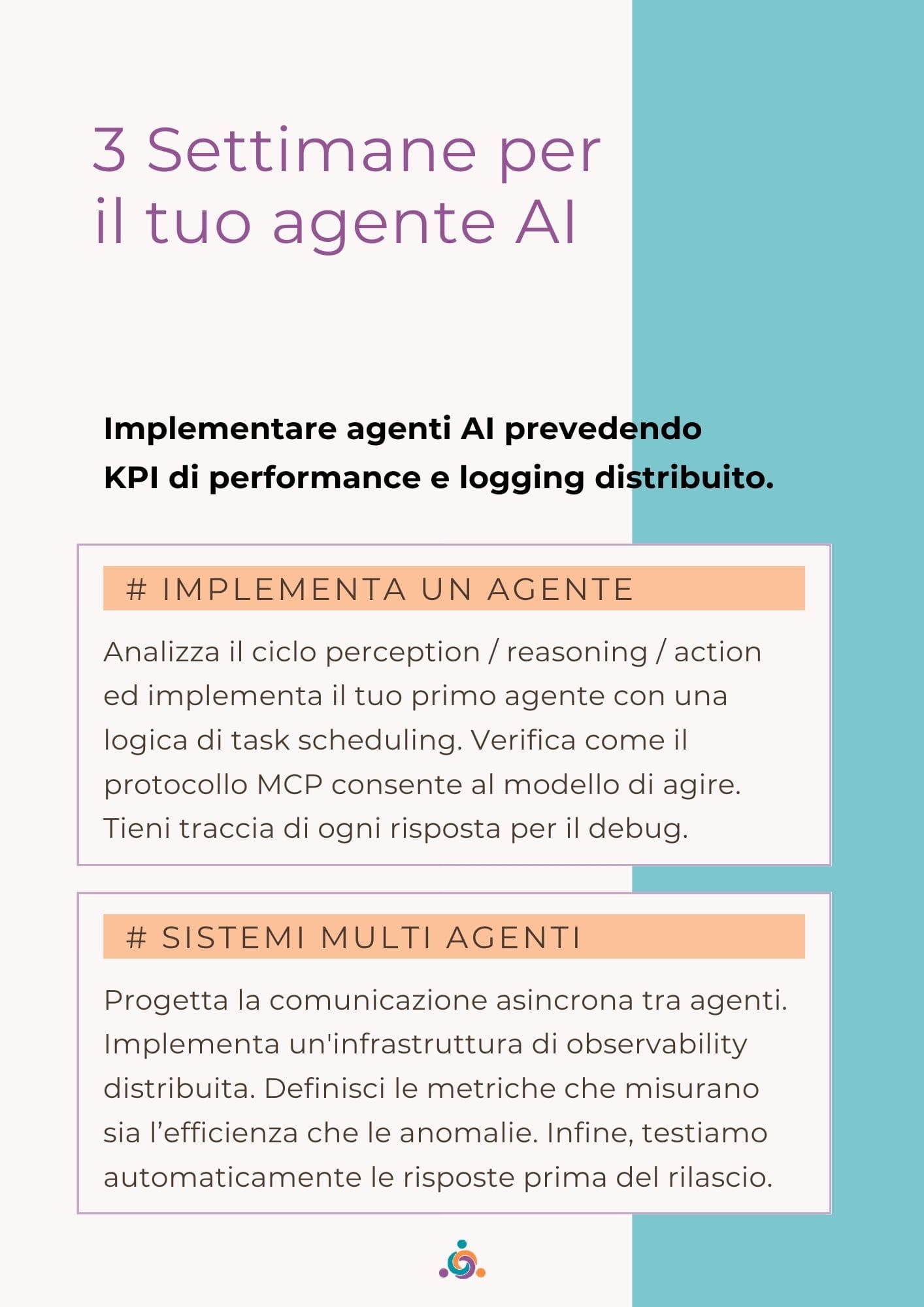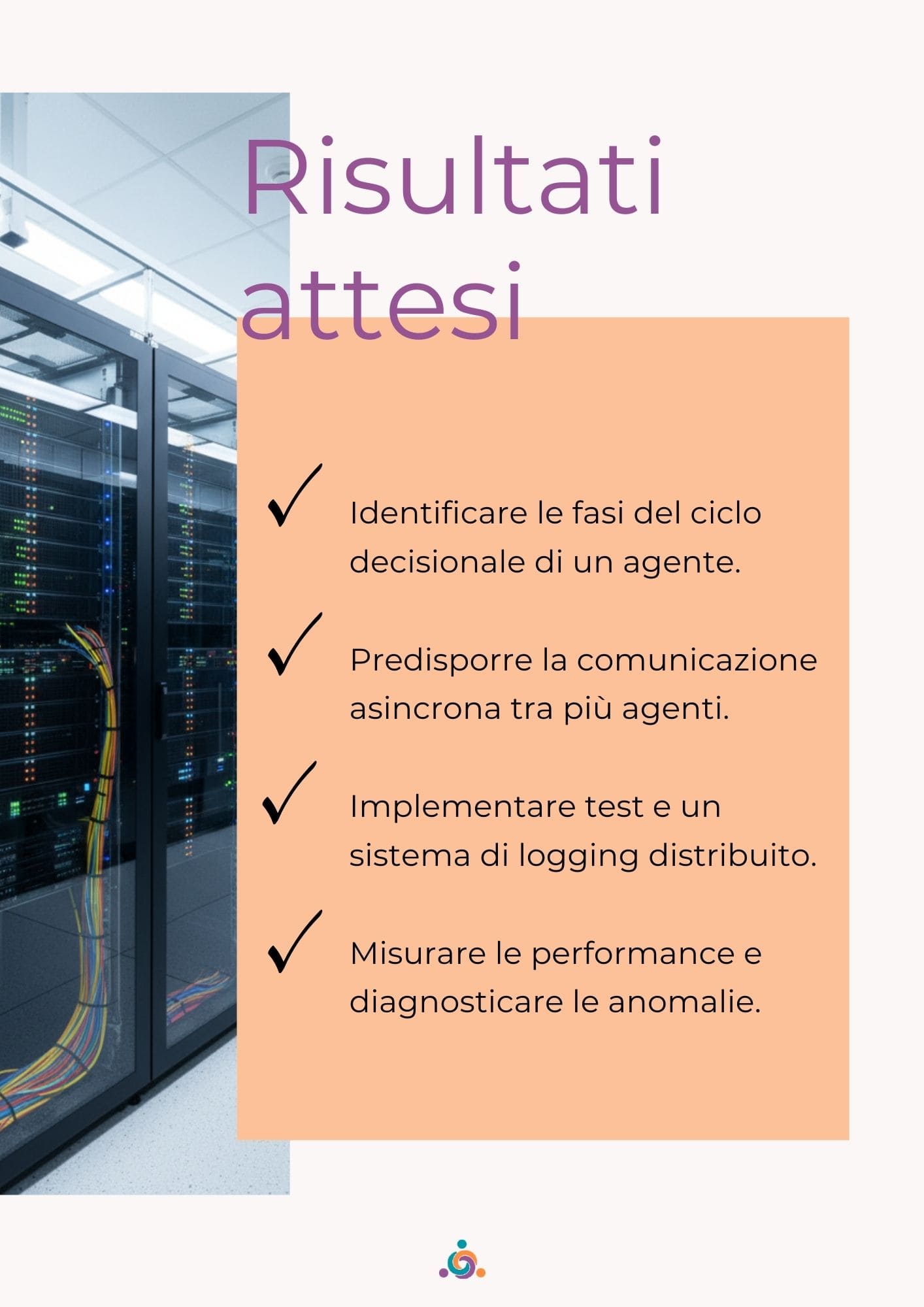 Progetta la comunicazione asincrona tra agenti. Implementa un’infrastruttura di observability distribuita. Definisci le metriche che misurano sia l’efficienza che le anomalie. Infine, testiamo automaticamente le risposte prima del rilascio.
