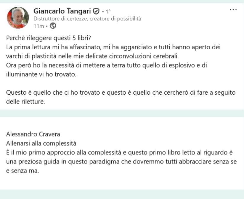 Per Giancarlo: “È il mio primo approccio alla complessità e questo primo libro letto al riguardo è una preziosa guida in questo paradigma che dovremmo tutti abbracciare senza se e senza ma.”