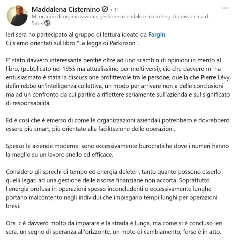 Da Maddalena: “…ciò che davvero mi ha entusiasmato è stata la discussione profittevole tra le persone, quella che Pierre Lévy definirebbe un’intelligenza collettiva, un modo per arrivare non a delle conclusioni ma ad un confronto da cui partire a riflettere seriamente sull’azienda e sul significato di responsabilità…”
