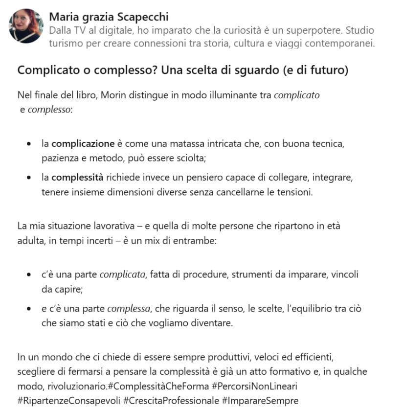 - la complessità richiede invece un pensiero capace di collegare, integrare, tenere insieme dimensioni diverse senza cancellarne le tensioni.