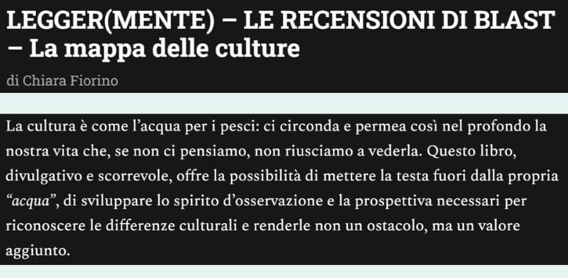 Dalla recensione di Chiara su Blast: “La cultura è come l’acqua per i pesci: ci circonda e permea così nel profondo la nostra vita che, se non ci pensiamo, non riusciamo a vederla. Questo libro, divulgativo e scorrevole, offre la possibilità di mettere la testa fuori dalla propria “acqua”, di sviluppare lo spirito d’osservazione e la prospettiva necessari per riconoscere le differenze culturali e renderle non un ostacolo, ma un valore aggiunto.”