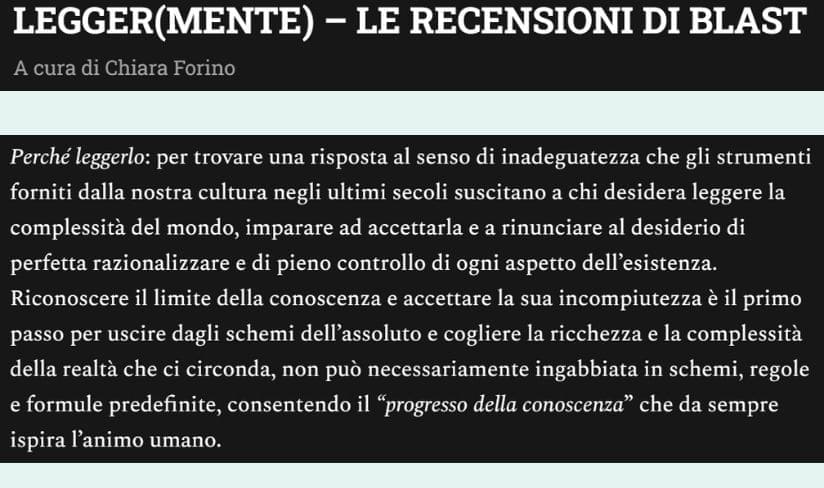 L’ottima recensione di Chiara ci ha convinti a leggerlo “…per trovare una risposta al senso di inadeguatezza che gli strumenti forniti dalla nostra cultura negli ultimi secoli suscitano a chi desidera leggere la complessità del mondo”