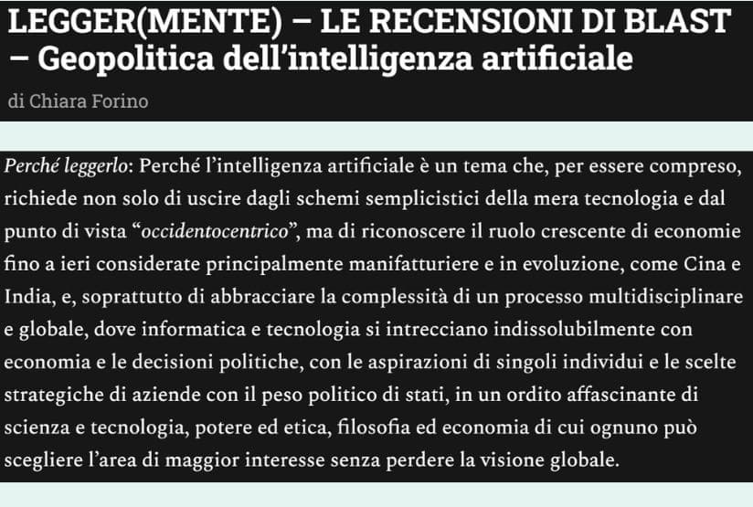 Per Chiara: “… un’opera monumentale…perché l’intelligenza artificiale è un tema che, per essere compreso, richiede soprattutto di abbracciare la complessità di un processo multidisciplinare e globale…”.